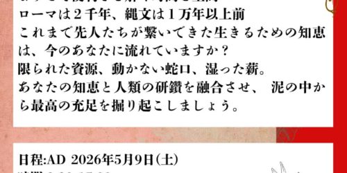 12月21日(日)10時00分~15時 縄文楽校庭(雨天:午前、集落センター) 「縄文の火まつり」 地球へいのちへの感謝のまつり 縄文楽校会員&新しい仲間も 場所:静岡県浜松市中央区大原町188-4 縄文楽校庭(センターは隣)集合 準備:1...